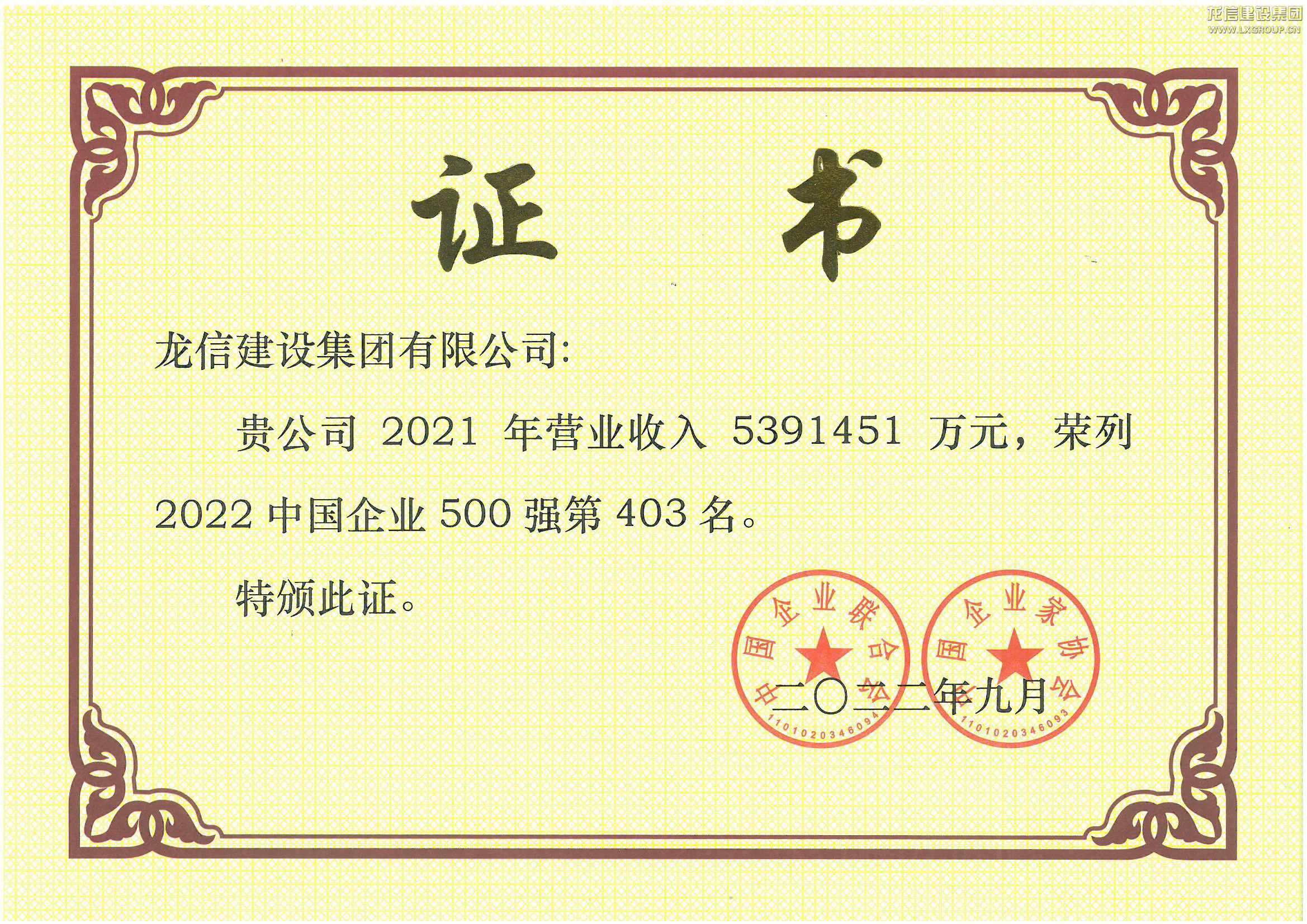 2022中國企業(yè)500強(qiáng) 第403位(證書)