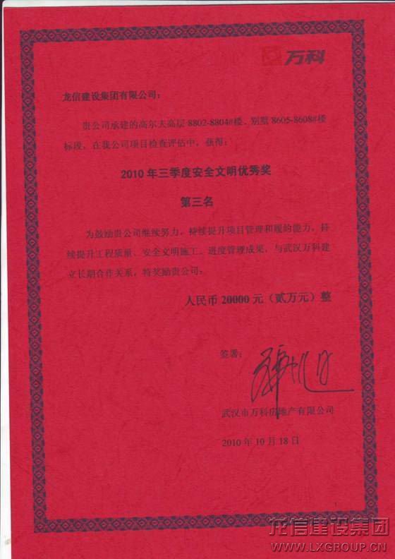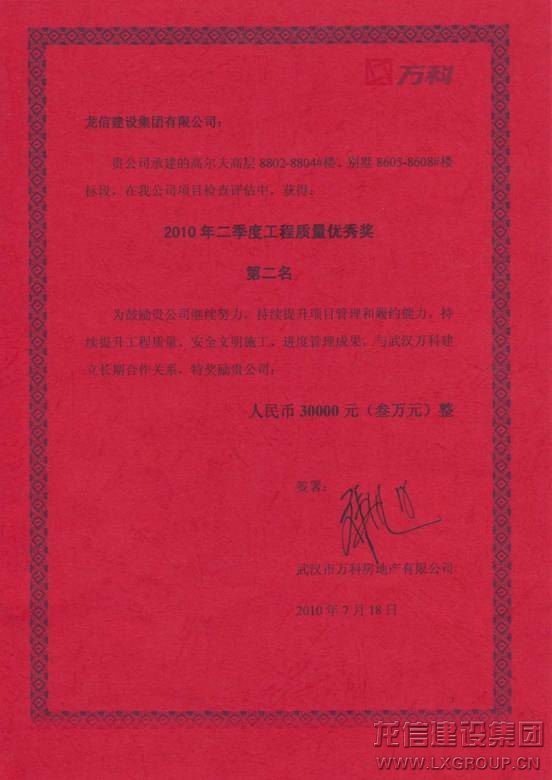 武漢高爾夫城市花園項目在2010年萬科所有項目的季度評選中所取得的優(yōu)越成績