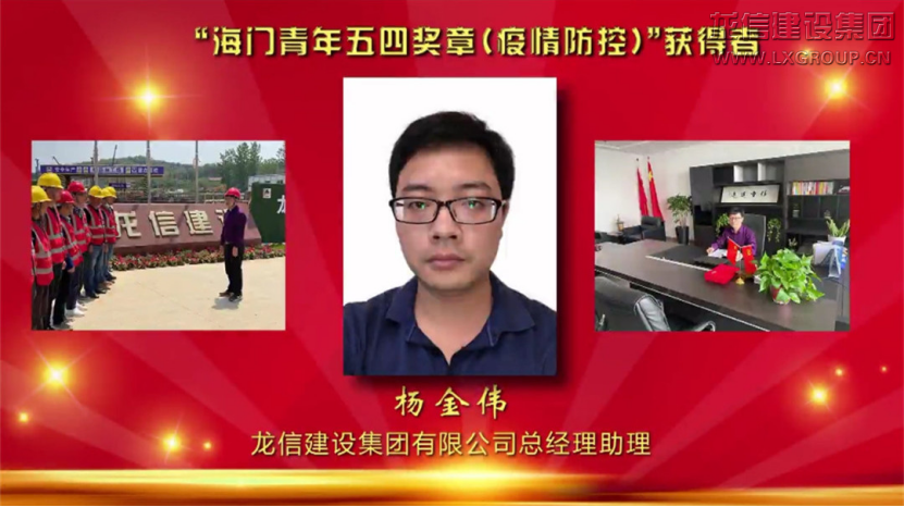 在五四青年節(jié)到來之際,共青團海門市委、海門市青年聯(lián)合會特向優(yōu)秀青年和集體頒發(fā)“海門青年五四獎?wù)?rdquo;。龍信建設(shè)集團有限公司青年志愿服務(wù)隊榮獲“海門青年五四獎?wù)录w”,龍信建設(shè)集團有限公司總經(jīng)理助理楊金偉榮獲“海門青年五四獎?wù)?rdquo;(疫情防控)。4月30日,由海門市新時代文明實踐中心辦公室、共青團海門市委主辦,海門市融媒體中心承辦,龍信集團等單位共同贊助的“不懼風(fēng)雨,奮勇前進”——海門市“五四”青年節(jié)線上文明實踐暨道德講堂總堂示范觀摩活動通過電視和網(wǎng)絡(luò)進行同步直播,活動現(xiàn)場進行表彰。