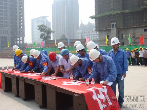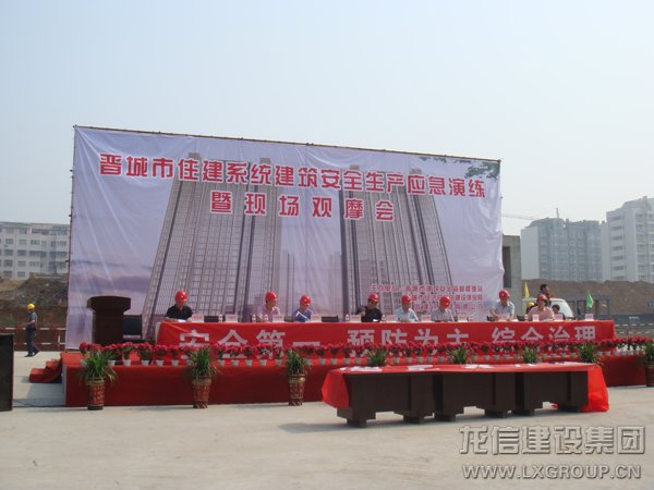 2011年6月29日上午,晉城市建筑施工安全生產應急演練在我龍信建設集團金城·蘭園項目部舉行!山西省安監(jiān)站副站長宮守河、晉城市經濟開發(fā)區(qū)管委會主任原光輝、晉城市建筑安全監(jiān)督管理站站長李乾坤等出席此次的觀摩會。項目演練圍繞高空墜落事故的救援救護、觸電事故的救援救護、火災事故的救援救護三項預案展開,主要檢查預案與實踐的差距,普及教育安全常識和救護技能。省市各級領導及項目部管理人員分別在安全生產橫幅上簽名,以承諾個人安全責任!
