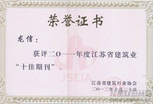 江蘇省建筑行業(yè)協(xié)會舉辦的2011年度江蘇省建筑業(yè)優(yōu)秀報、刊、網(wǎng)和優(yōu)秀通訊員評選活動,我公司《龍信》雜志和公司網(wǎng)站參加評選,其中《龍信》雜志被評為江蘇省建筑業(yè)十佳期刊,公司網(wǎng)站被評為江蘇省建筑業(yè)優(yōu)秀網(wǎng)站。